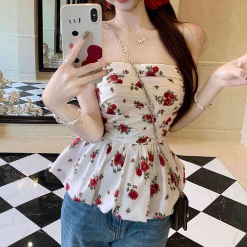[에이치플러스몰]오프숄더 플라워패턴 스모크주름 프릴 크롭 블라우스