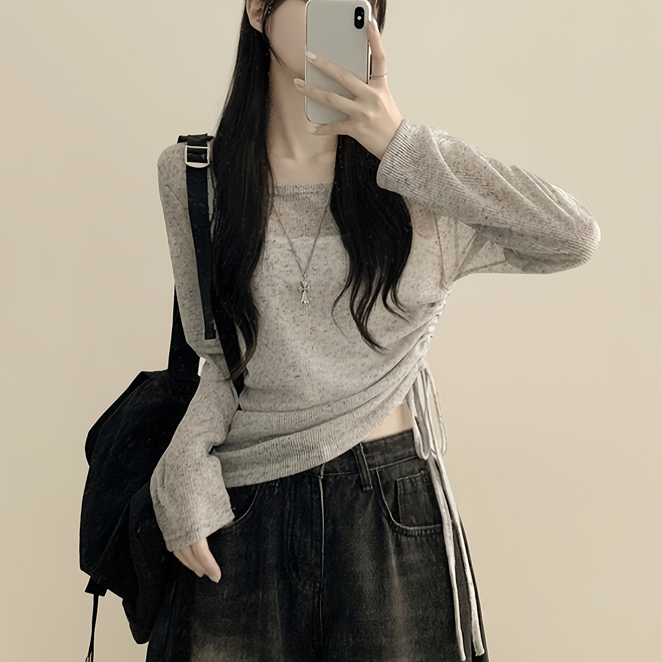 TEMU 한국 스타일 우아한 반투명 라운드넥 오프숄더 블라우스 - 긴 소매 한국 스타일 셔츠, 드로스트링 허리 타이, 가볍고 여유로운 탑, 봄 여름 가을 캐주얼 & 포멀 웨어 (없음)|여름블라우스
