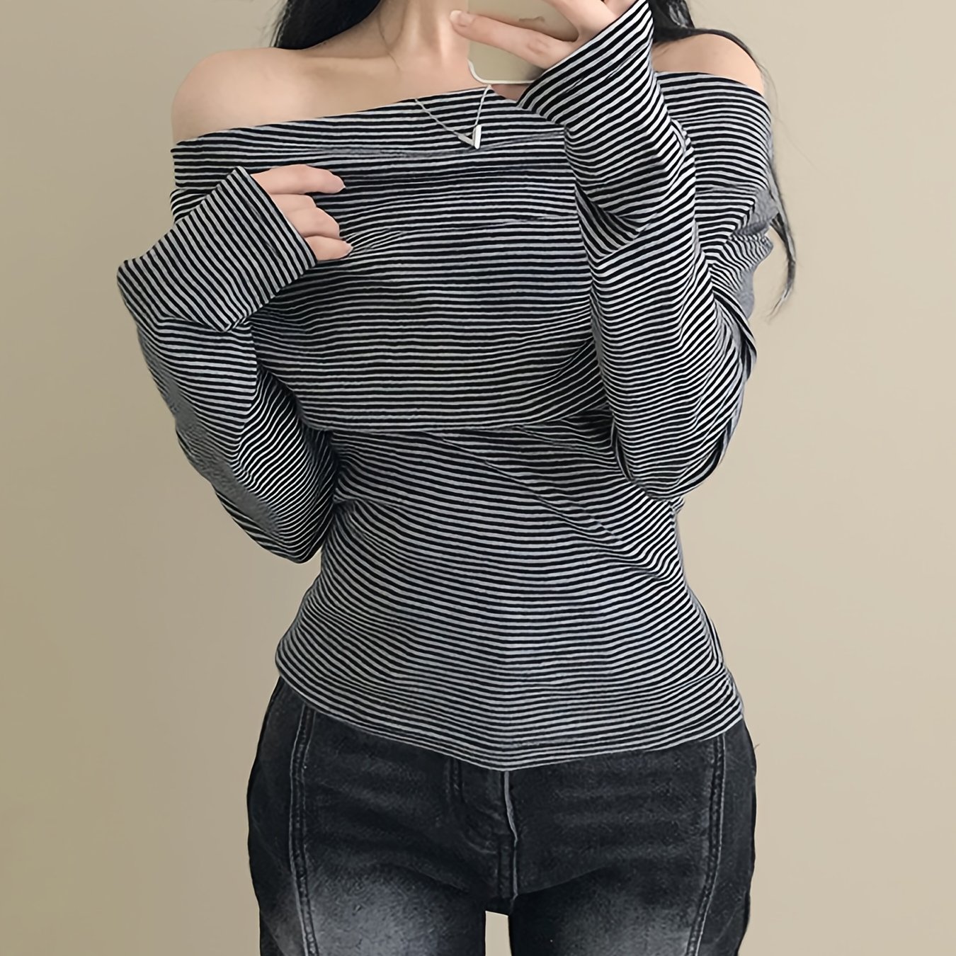 TEMU 여성용 오프숄더 탑 - 허리 집게 핏 긴팔 셔츠, 캐주얼 & 포멀 룩 블랙 & 화이트 수평 블라우스 - 비침 방지 원단, 봄 패션, 레트로 스타일, 고품질 스티칭, 트렌디한 여성 상의