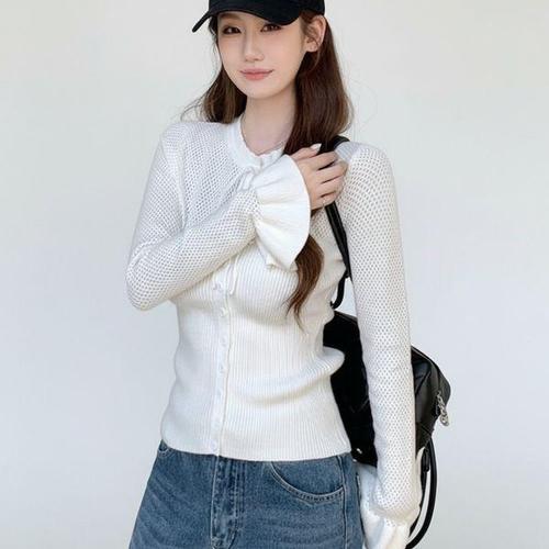 [신상오픈런]여성 슬림핏 브이넥 펀칭 프릴 소매 니트 가디건
