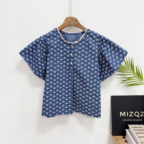 미즈큐즈 / 플라워 펀칭 자수 볼륨 날개 소매 데님 블라우스 연청