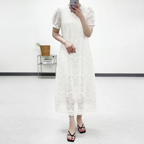 미즈큐즈 / 브이넥 펀칭 레이스 자수 밑단수술 퍼프소매 반팔 롱