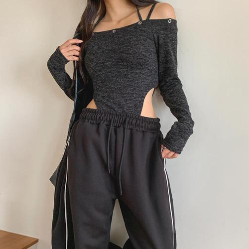 [다잇템][다잇템] 여성 슬림 골지 펀칭자수 롱슬리브 스트랩 티셔츠_23436026_588872