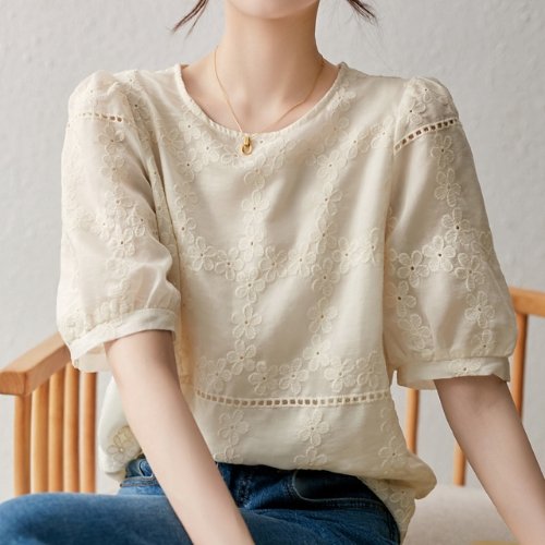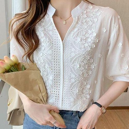 [에이치플러스몰]펀칭 자수 데일리 반팔 여성 클래식 여름 블라우스 데