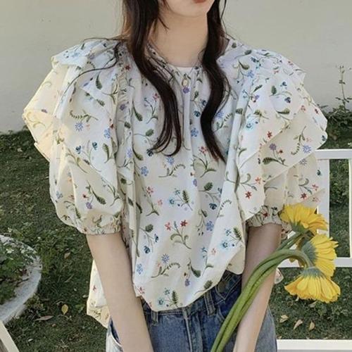 [끌레아]여자 러플 플라워 블라우스 어깨 프릴 페미닌 여유핏