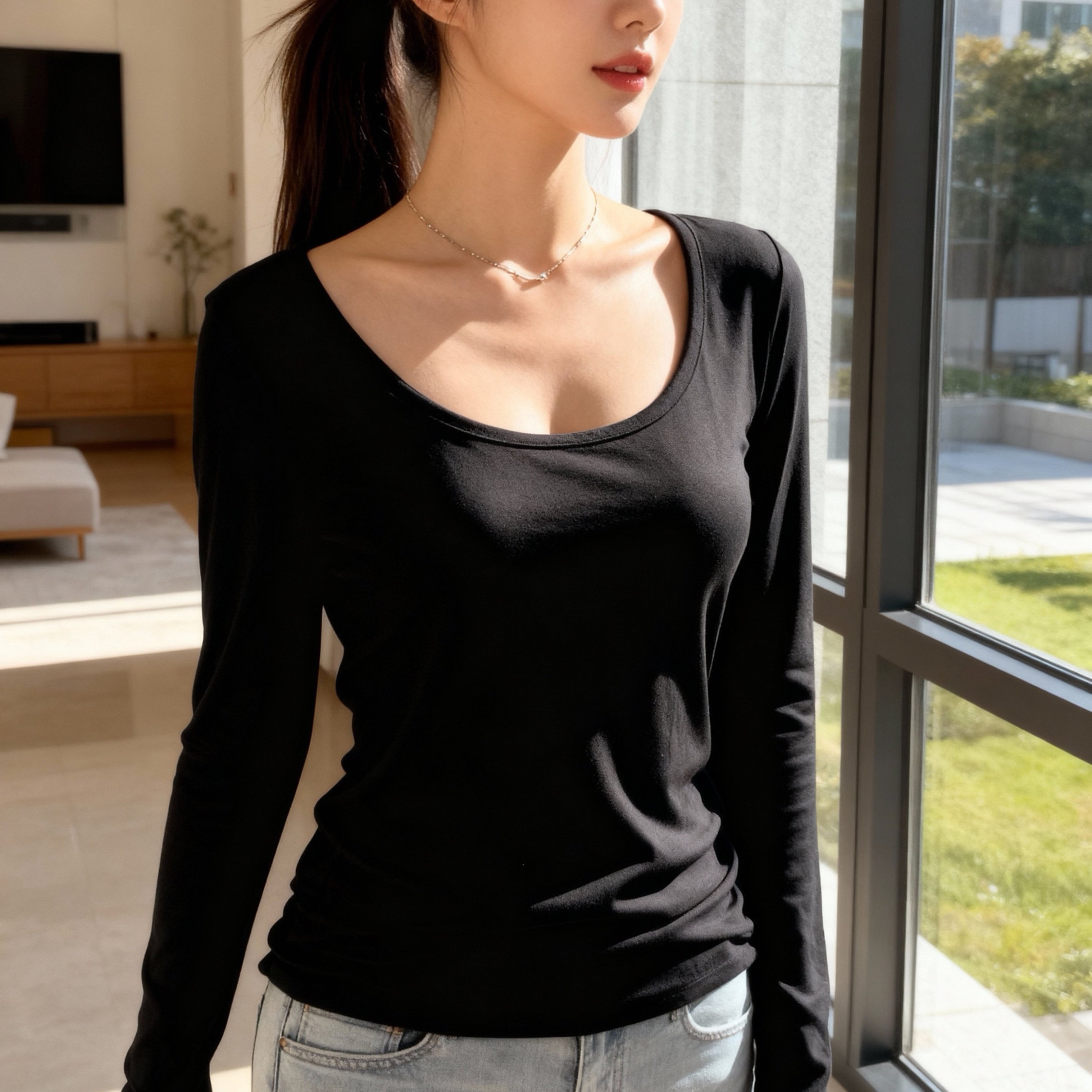 TEMU 블랙 베이스 레이어 여성 내복 봄 가을 2025 신상 긴팔 티셔츠 V넥 디자인 여성용 탑