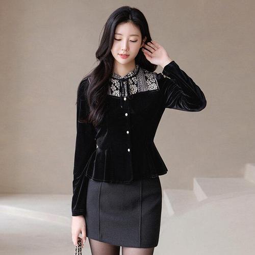 [스타일온미][루이스엔젤] 세레드 하트 라인 플라워 레이스 배색 고혹적인 벨로아 페플럼 블라우스