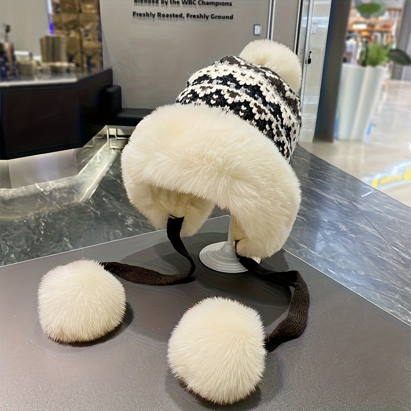 TEMU 에스닉 스타일 모자, 가을 겨울 모자, 플러시 통통하고 따뜻한 몽골풍 모자, 여성용 볼형 귀마개 모자, 큰 머리둘레용 레이펑모자