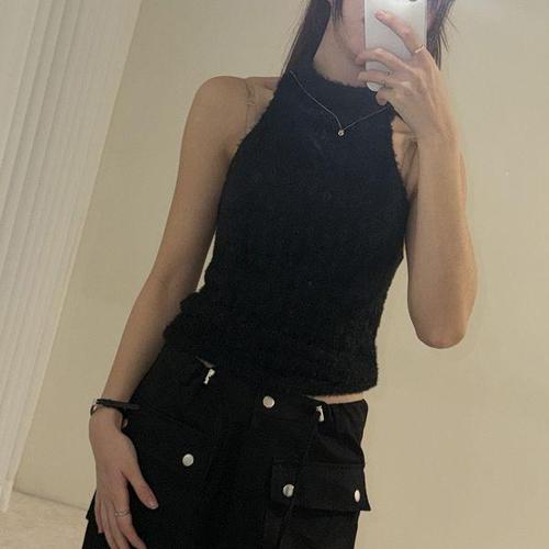 [옷자락] 여자 겨울 크롭 패턴 터틀 홀터넥 백리스 슬림 나시