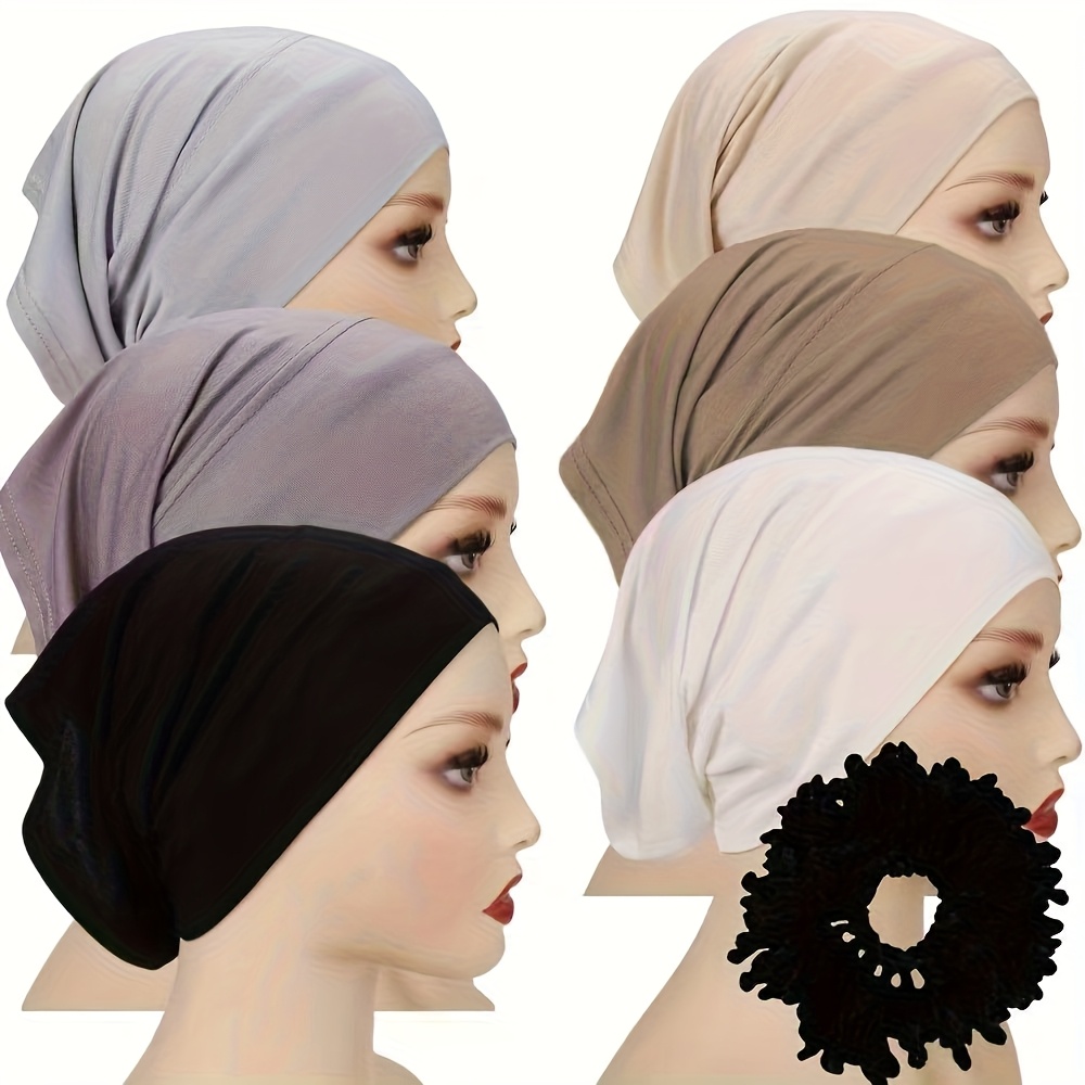 TEMU 6개의 넓은 브리밍 베이스 모자 + 1개의 헤어 밴드, 무슬림 여성용 헤드 스카프, 푹신하고 내색되지 않는 폴리에스테르 통기성 헤드 가드, 큰 탄력과 내구성이 뛰어난 올 시즌 다용도 튜브 모자
