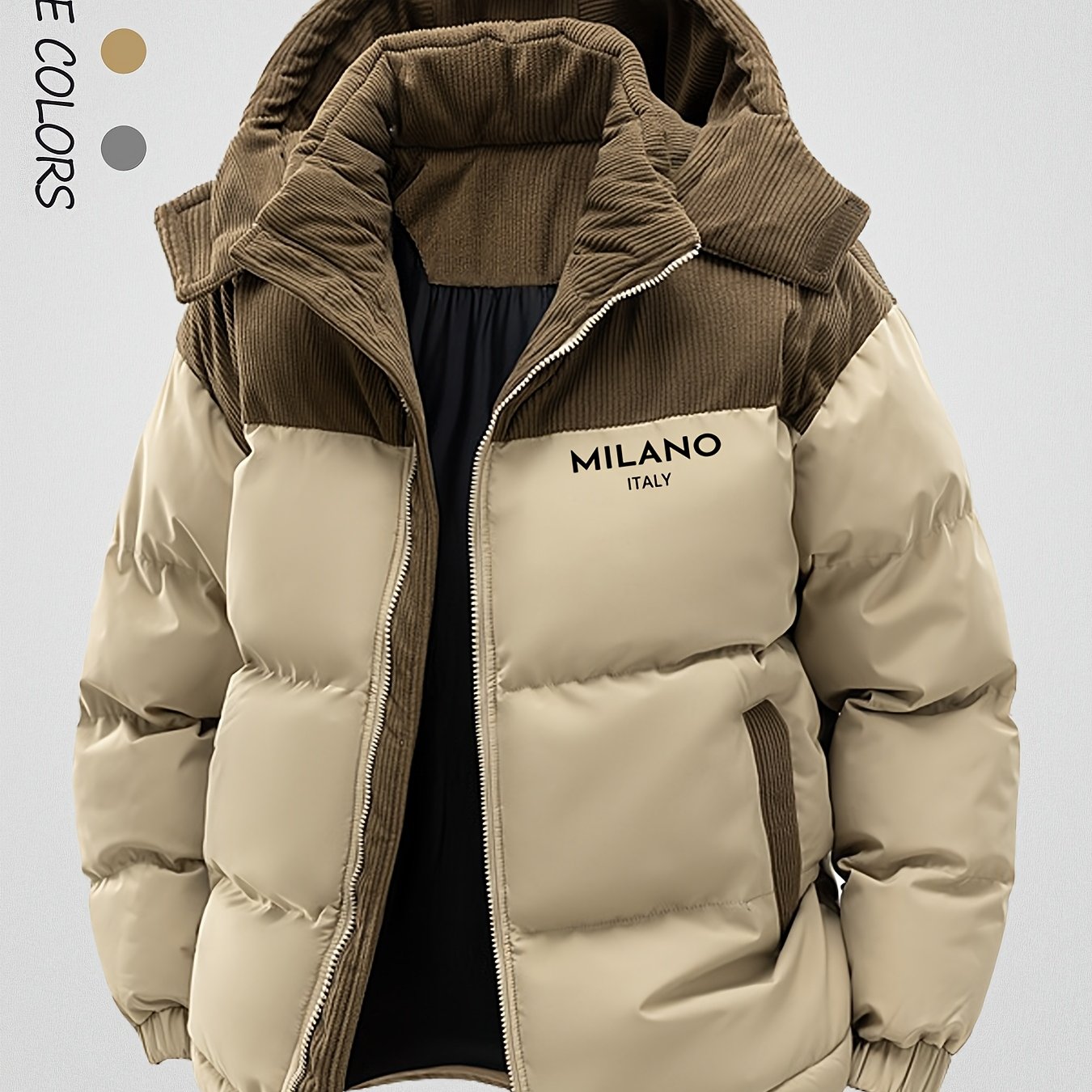 TEMU 남성용 헤비듀티 겨울 후드 재킷 - 풀 지퍼 코트, 스타일리시 아우터, 전면 풀 지퍼 & 후드 칼라, 긴팔 캐주얼 추위 방지 코트 (베이지/블랙) - 드라이클리닝 전용, 신축성 없는 원단