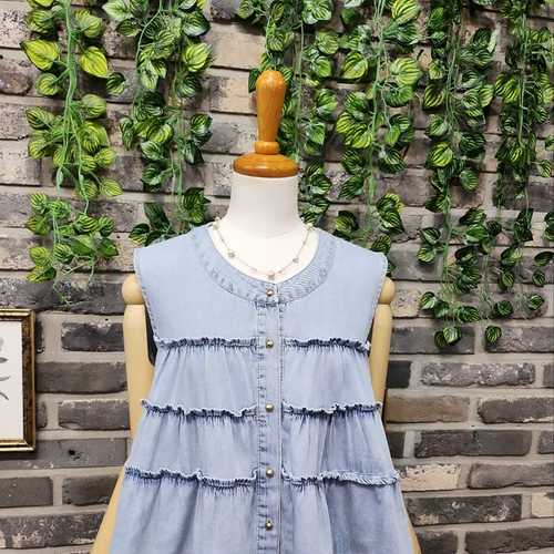 퐁당 / 프릴 층층 민소매 데님 청 블라우스