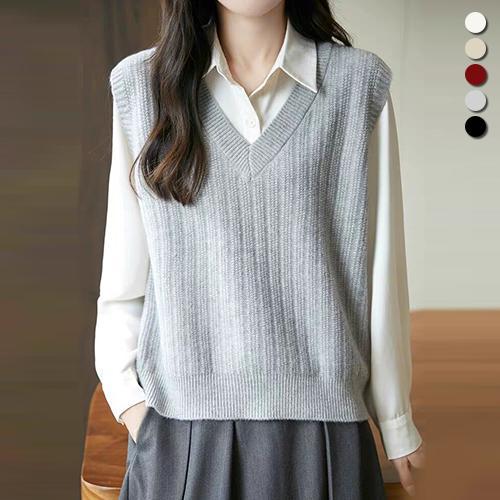 TEMU 여성용 캐주얼 V넥 조끼 - 민소매 루즈핏 솔리드 컬러 스웨터, 기계 세탁 가능한 가을 겨울 레이어링 필수품, 리브 디테일, 질감 있는 원단