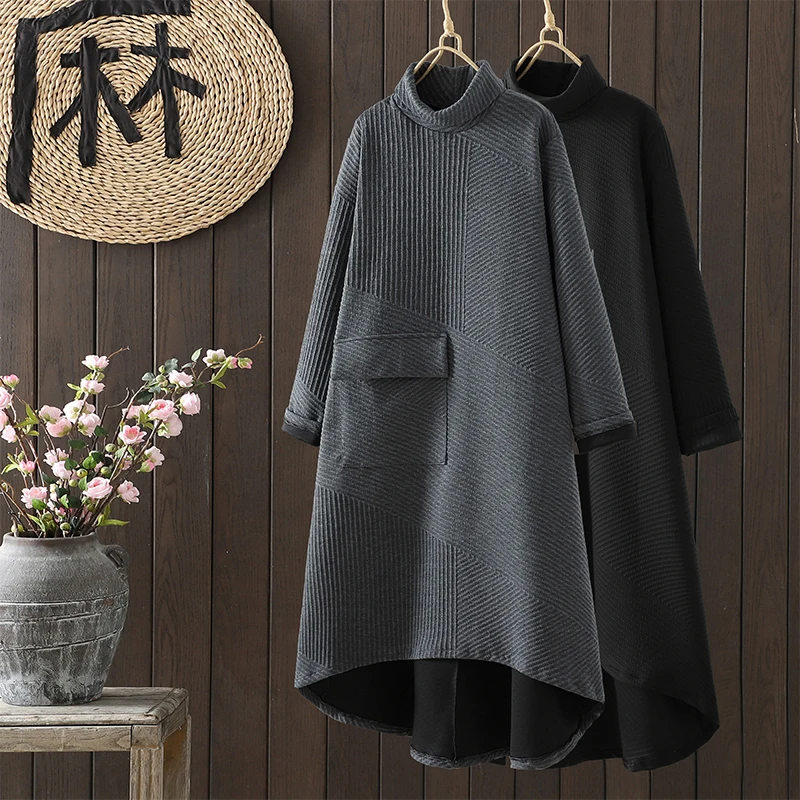 레트로 예술적 하이 칼라 긴 소매 미디 드레스 루즈 핏 가을 겨울 플러스 사이즈 솔리드 컬러 출퇴근 스타일 한국 패션