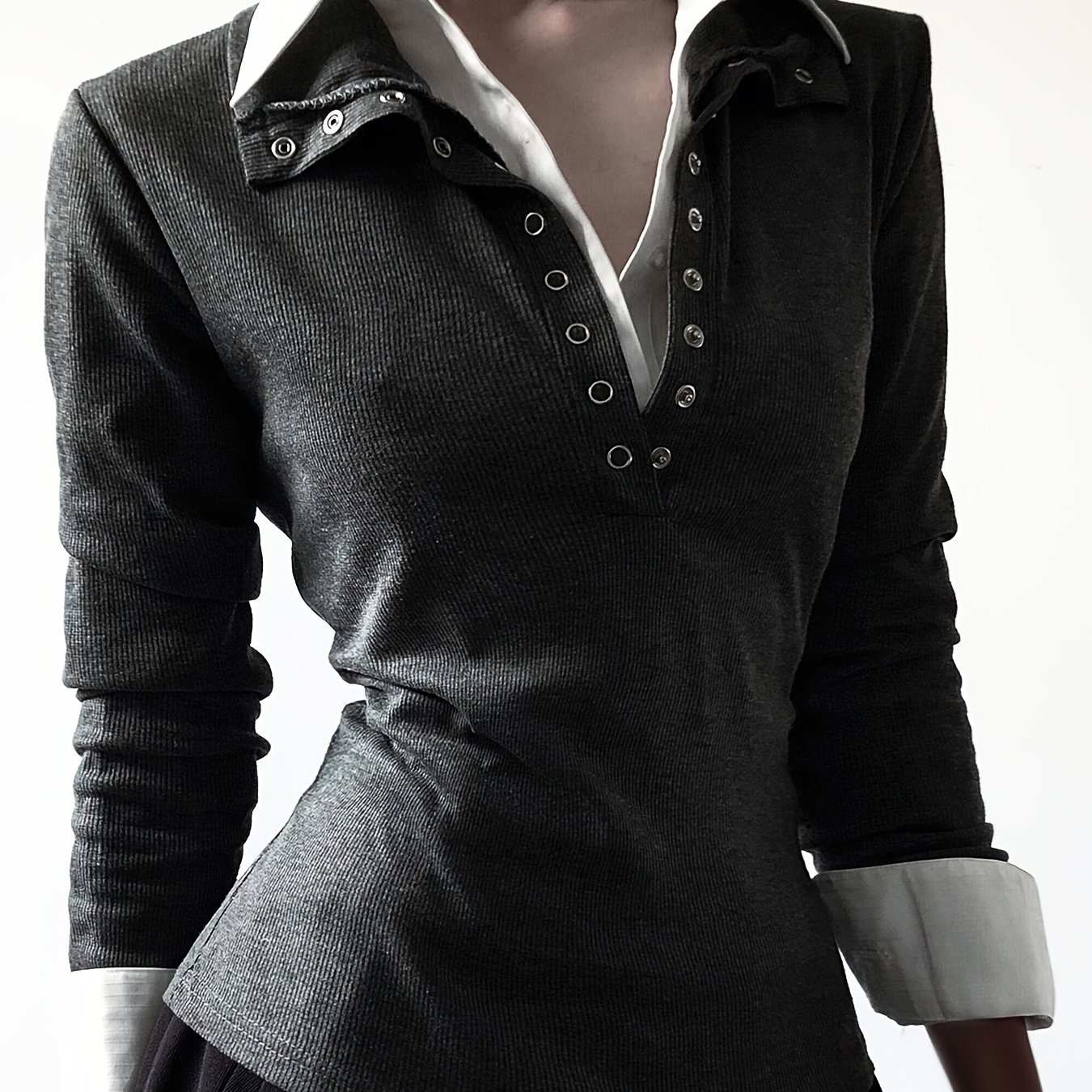 TEMU 여성 캐주얼 시크 투톤 컬러 블록 블라우스 - 긴소매 버튼 앞면 셔츠, 대비되는 칼라, 솔리드 컬러 탑 (가을/겨울, 오피스, 파티, ) - 다용도 한국 스타일 여성 의류, 여성 블라우스, 파티 복장