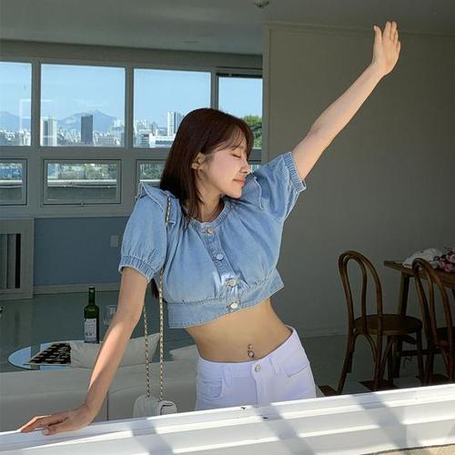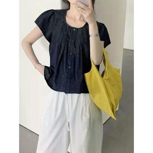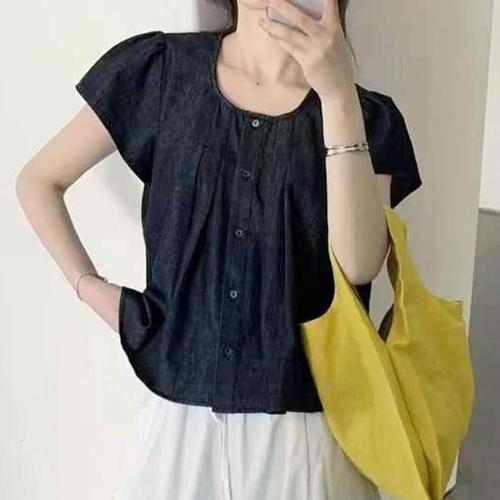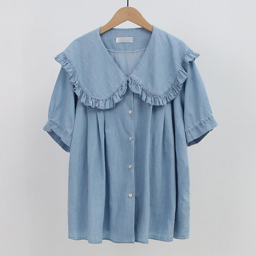 여성 라운드넥 생지 청 반팔 프릴 블라우스 MSE-WBL-20683-진청