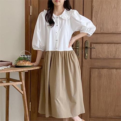 |KDO3004|러레기 긴원피스 여성 숏슬리브 프릴카라 플레어