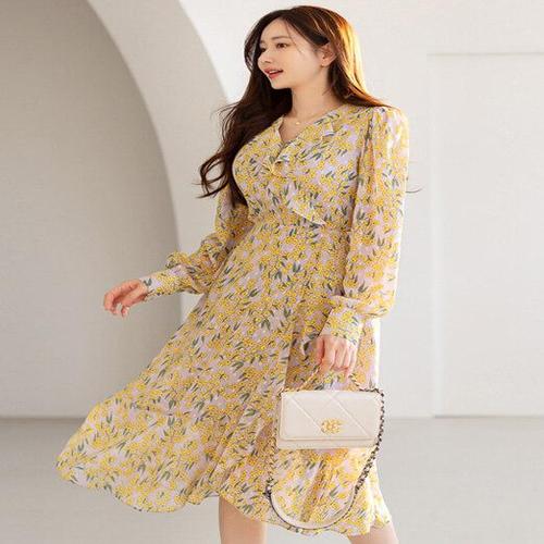 [셀러허브_여성트랜드패션]ONM 패턴 원피스 플라워 프릴 긴팔 쉬폰 봄가을 롱스