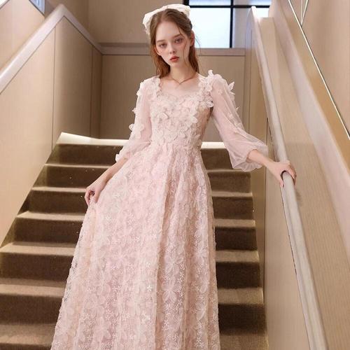 [교복몰]라이트핑크 플라워 하트라인 스퀘어넥 드레스 교복