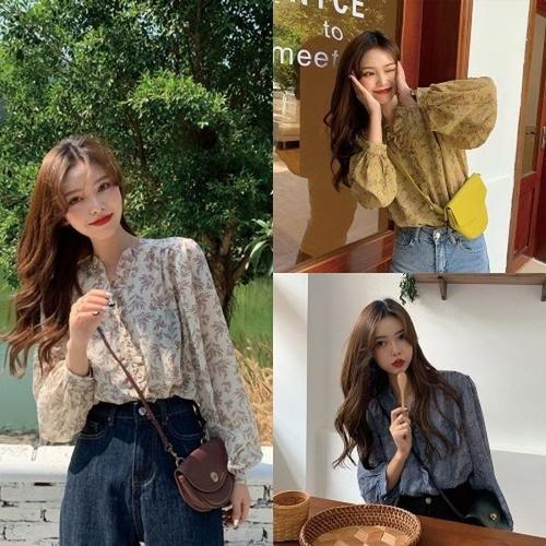 [엄지척]쉬폰 소매 플라워패턴 크롭 블라우스 브이넥_19660911_667501