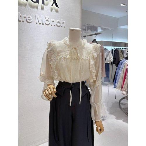 리본 포인트 플라워 패턴 기모 레이스 블라우스