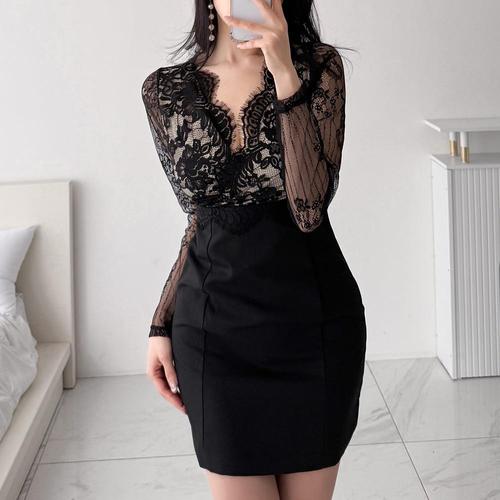 [옷자락]여자 플라워 레이스 시스루 글램룩 블랙 미니원피스