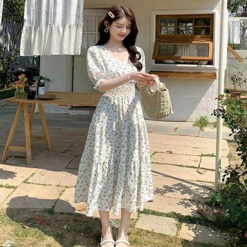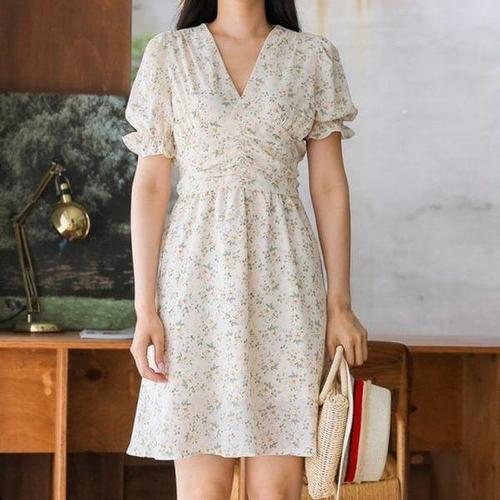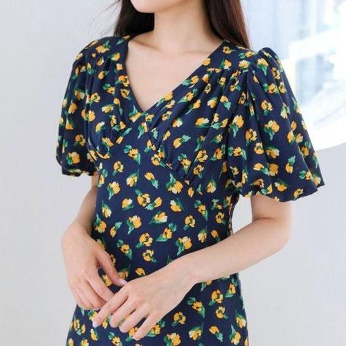 크레스티 여성 일상 슬림핏 퍼프소매 셔링 원피스 여름 바캉스 플라워 쉬폰 원피스