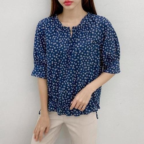 [다잇템][다잇템] 여자 클래식 라운드 슬릿 면원단 프린팅 플라워 블라우스_13836274_588872