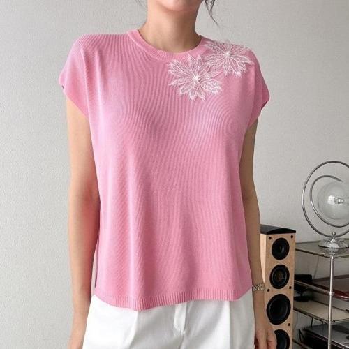 [올포유]여성-몸판 신축성 좋은 져지 원단 소매는 시원한 쉬폰 소재/카라 주름 포인트 7부 소매 플라워패..