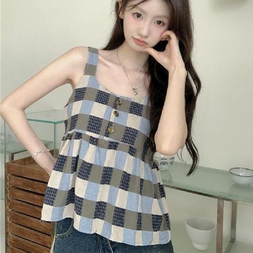 [엄지척]여성 캐주얼 체크 민소매 플레어 나시 탑_19610438_667501