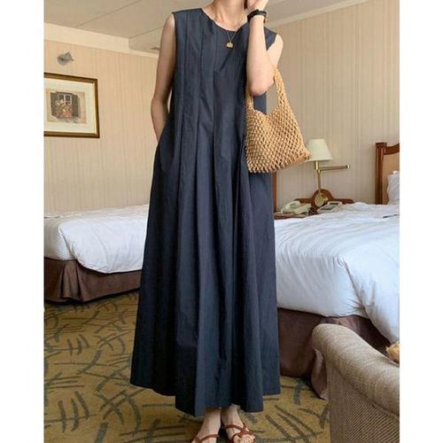 [에이치플러스몰]여성 핀턱 나시 롱원피스 1P 플레어 A라인 치마 휴가