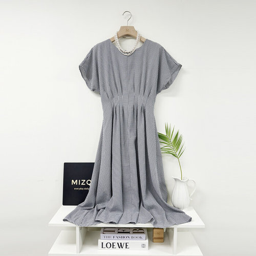 미즈큐즈 / 체크 드롭 숄더 허리 핀턱 뒷밴딩 플레어 롱원피스 4