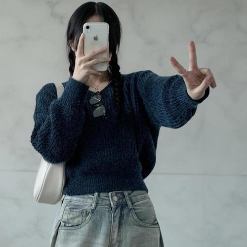 [옷자락]여성 겨울 솔잎 브이넥 크롭 퍼프 소매 니트 긴팔