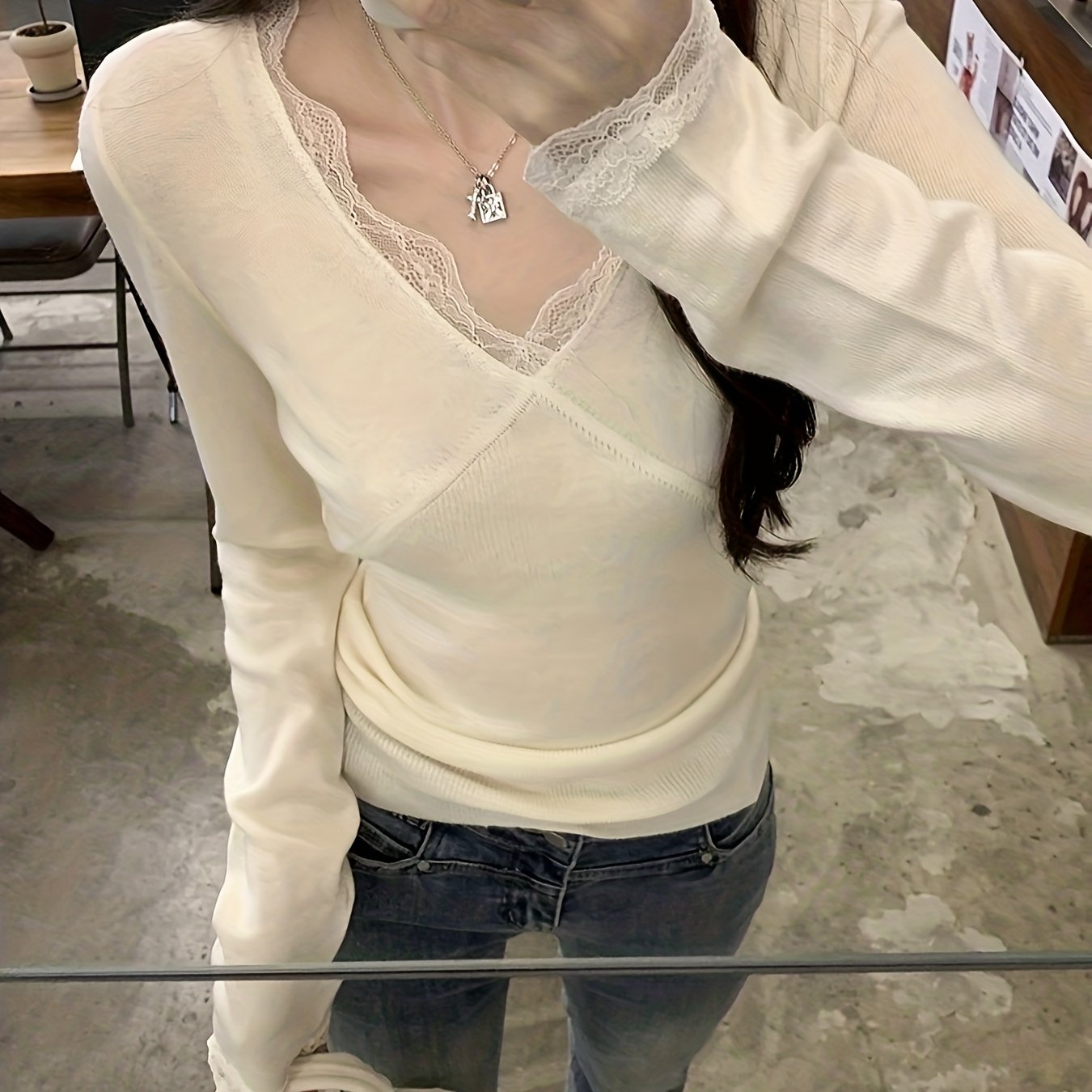 TEMU 프렌치 스타일 화이트 레이스 V넥 스웨터 - 슬림핏 숏 기장 풀오버 탑, O라인 실루엣 & 우산 밑단, 세탁기 사용 가능한 가을/겨울 레이어링 아이템, 일본/한국 스타일 컬렉션 (패딩 없음)