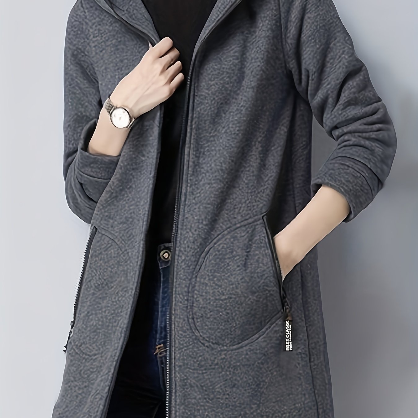 TEMU 여성용 포근한 기모 안감 후드 재킷 - 캐주얼 긴소매 지퍼업 포켓, 단색, 루즈핏, 가을/겨울에 적합, 캐주얼 아우터