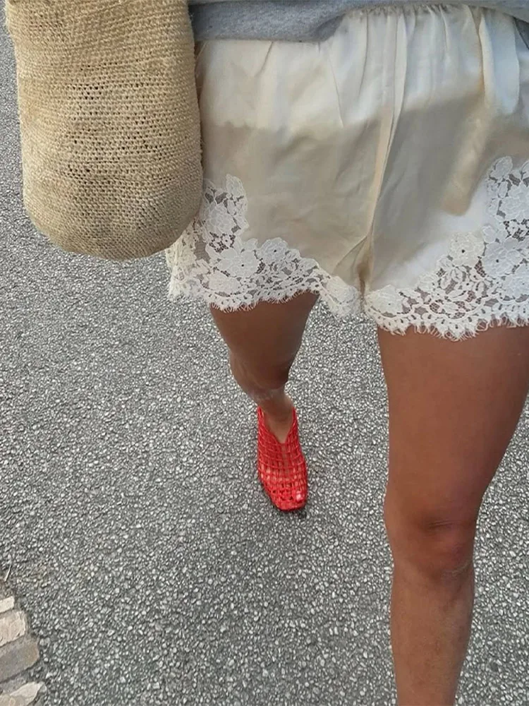 여성 레이스 프릴 솔리드 화이트 반바지 2025 여름 가을 패션 스위트 새틴 여성 짧은 바지 휴가 해변 레이디 의류