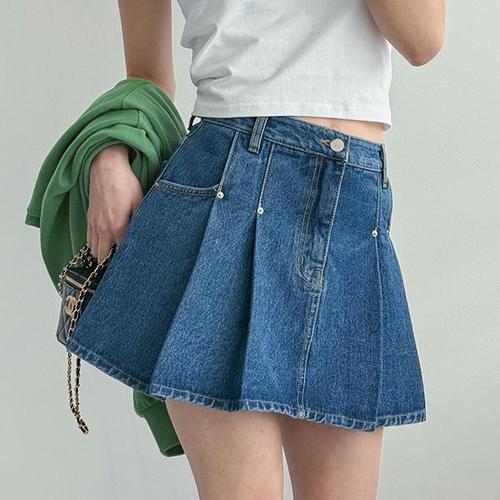 데님 미니 스커트 하이웨스트 카고 플리츠 A라인 미니스커트