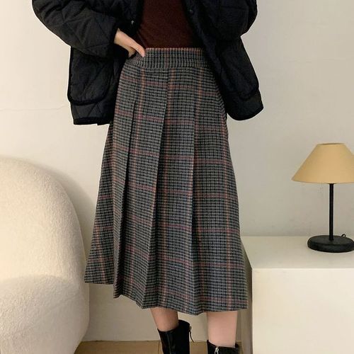 옷자락 / 여자 겨울하객룩 버튼 플리츠 울치마 체크 랩 롱스커