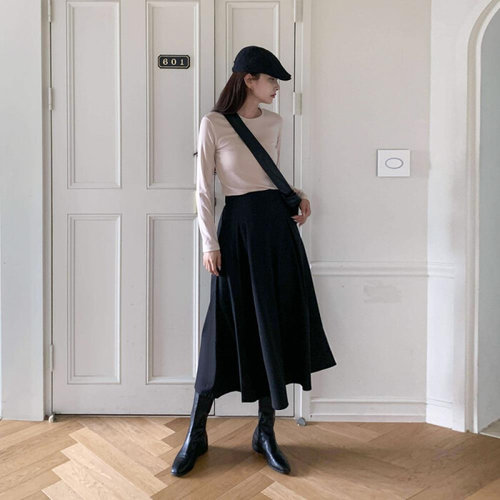 [옷자락]여자 겨울 도톰 코튼 플리츠 배색 밴딩 롱스커트