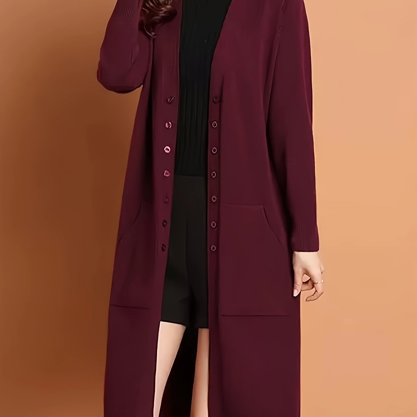 TEMU 플러스 사이즈 - 우아한 V넥 롱 카디건 | 여성용 패셔너블 캐주얼 단색 스웨터, 가을/겨울 시즌, 중간 정도 신축성 있는 원단.