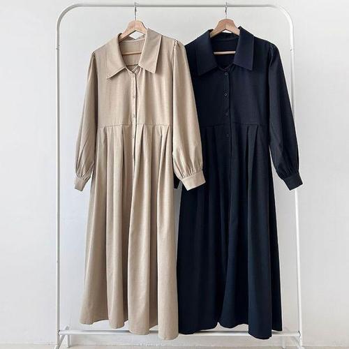 [다잇템]여성 롱 단추 SS 들러리룩 카라넥 핀턱 드레스