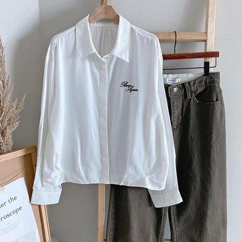 [옷자락] 여성 자수 글씨 레이온 루즈핏 핀턱 긴팔 블라우스