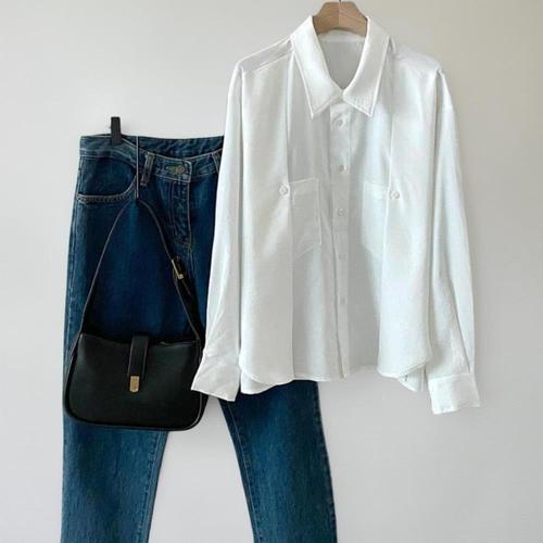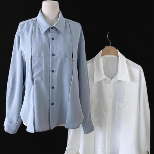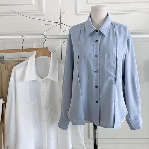 [옷자락] 여성 단색 핀턱 절개 주머니 루즈핏 긴팔 블라우스