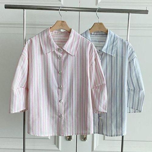 [옷자락]여성 오버핏 배색 잔줄지 핀턱 7부 소매 셔츠