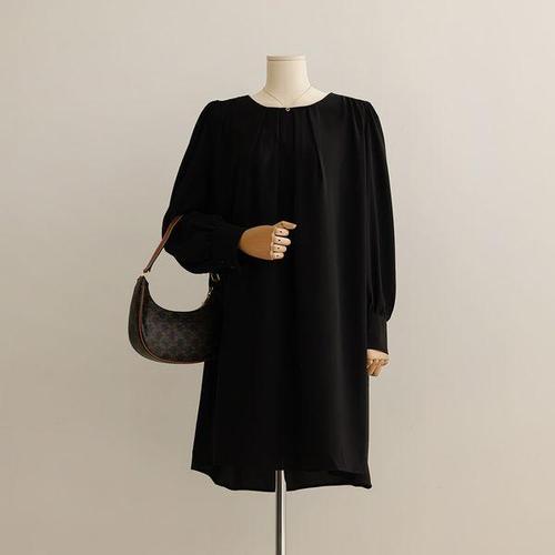 [모노무드]모노무드 라운드넥 롱원피스 소매핀턱 밑단 셔링 플레어 디자인