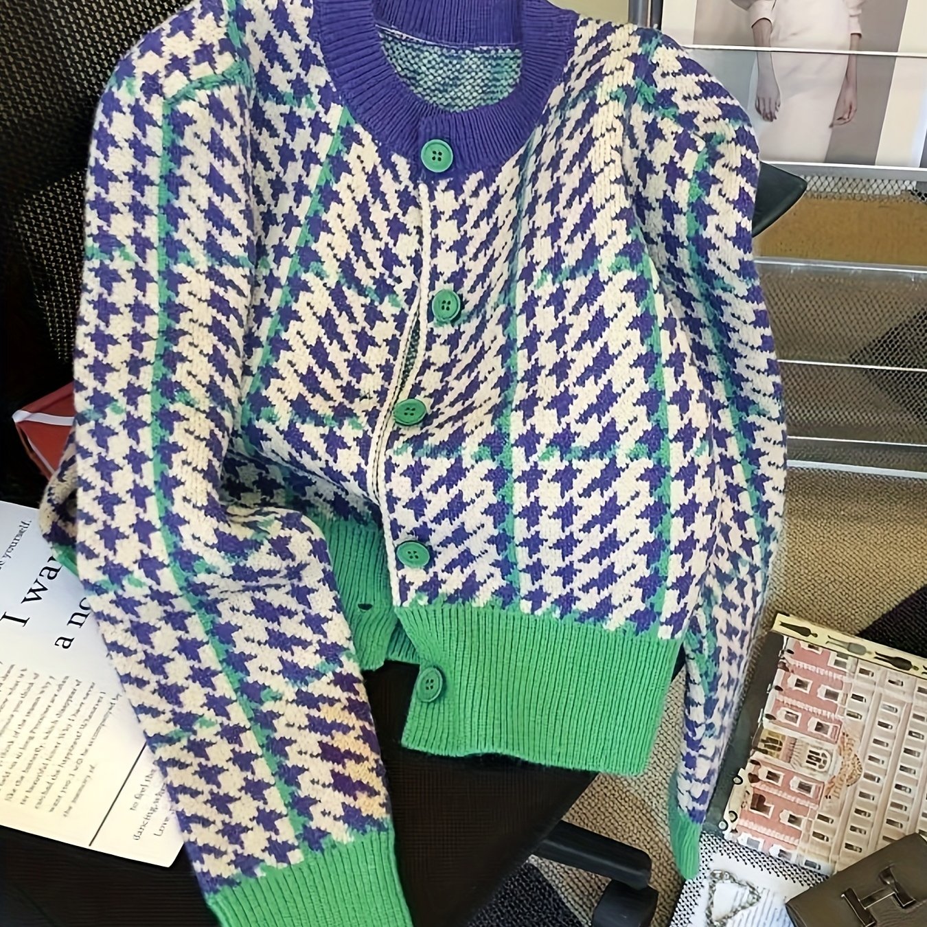 TEMU 여성을 위한 라운드넥 체크 컬러 블록 디자인의 세련된 여성용 숏 가디건, 가을/겨울에 적합