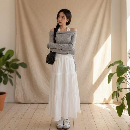 나시 롱 원피스 여성 브이넥 슬림핏 니트 라인 스커트 (WFGYK04)