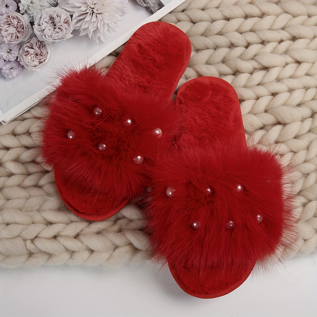 TEMU 여성용 올시즌 실내/실외 슬리퍼 - 플러쉬 & 장식 디자인, 오픈토 디자인, 부드러운 소재 상단 & TPR 밑창, 손세탁 가능 - 블랙, 브라운, 레드 컬러, 귀여운 인도어 슈즈, 내구성 있는 미끄럼 방지 기능