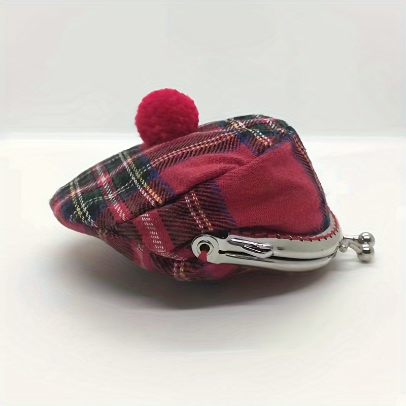 TEMU 빨간 폼폼과 금속 액센트가 있는 세련된 미니 체크 패턴의 코인 지갑 - 여성용 컴팩트 지갑, 열쇠 및 동전에 이상적, 흰색 배경, 지갑 액세서리