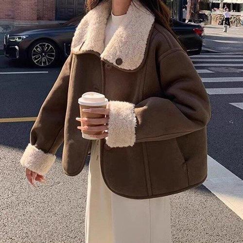 여성 모던 스웨이드 양털 하프 코트 핑크